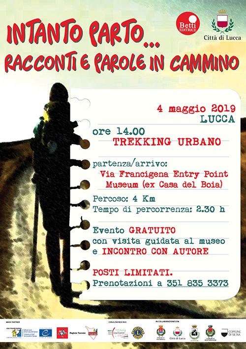 Alle ore 14.00 appuntamento con il trekking urbano, lungo le via Francigena che attraversa la città di Lucca. Il trekking, accompagnato da una guida esperta, avrà punto di partenza ed arrivo il museo Via Francigena Entry Point (ex Casa del Boia), prevede di seguire il percorso circolare di circa 4 Km lungo le mura della città e attraverserà il centro storico. La passeggiata si conclude con la visita al museo e l’incontro con uno degli autori vincitori del premio letterario (Marina Berti – terza classificata per la categoria Over25).